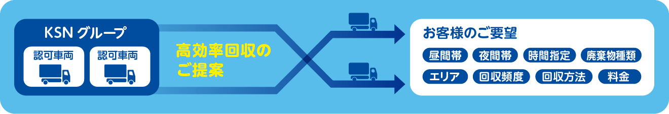 KSNグループが所有する許可(産業廃棄物、事業系一般廃棄物等)を最大限活用して、高効率な回収など、お客様に新たなソリューションをお届けします。